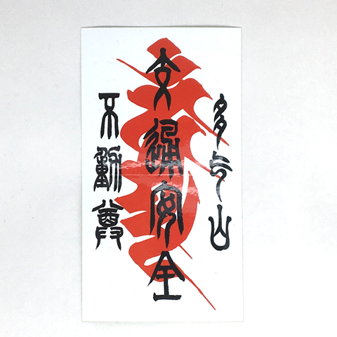 不動明王を表す梵字「カンマン」が描かれた角札風のステッカー。
